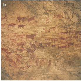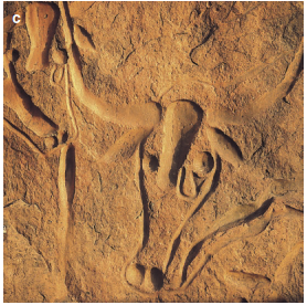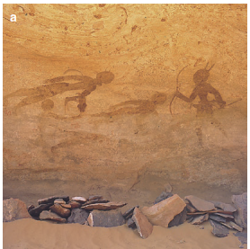 Fig. 17.8. Rock paintings and engravings indicate once more humid climatic conditions in central Saharan mountains. Pictures of hunters a and large grazing herds b near Sefar (Tassili), southern Algeria, are nearly 8000 years old. The “crying cows from Terarart” c near Djanet are about 5000 years old and indicate a gradual increase in aridity. (Photos: K. Müller-Hohenstein)