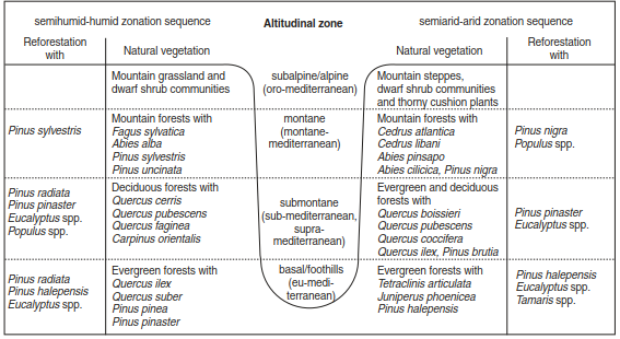 Fig. 17.19. Altitudinal belts of dominant tree species of natural vegetation and the most important exotic tree species used in reforestation in Mediterranean region. (Müller-Hohenstein 1991)