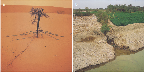 Fig. 17.21. Desertification in areas where people apply inappropriate forms of land use. a A single tree (Commiphora africana) in the southern Sahel of Mauretania is witness to former removal of dry forests, which disappeared because of excessive grazing and movement of sand dunes. b Incorrect irrigation with water of high salt content and inadequate drainage has caused salinisation in oases that had functioned for centuries with traditional cultivation (Dakhla Oasis, New Valley, Egypt). (Photos: K. Müller-Hohenstein)