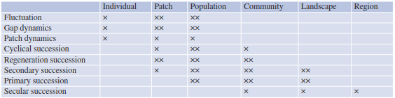 Table 17.4. Relationships between spatial and temporal dimensions in changes in vegetation. The terms in the table headers refer to spatial dimensions. A patch is a small homogeneous area (ecotope), a gap a small open space in the forest (after van der Maarel 1988)