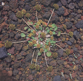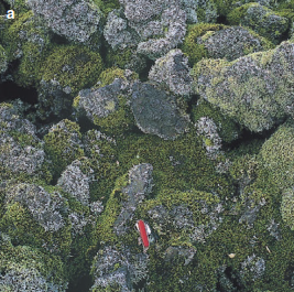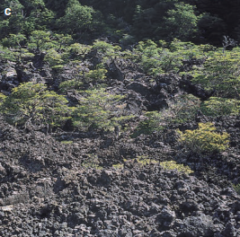 Fig. 17.30. Different stages of primary succession. a On fresh volcanic lava dense moss and lichen communities have developed after 8 years. b Only specialists among the vascular plants (e.g. Pozoa volcanica) become established quickly on almost unweathered rocks without soil. c Only after several decades do the first trees (Nothofagus obliqua, N. dombeyi) form open woodland vegetation. Photos were taken on sites on Llaima Volcano in southern Chile. (Photos: K. Müller-Hohenstein)