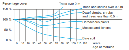 Fig. 17.31. Succession on moraines of Aletsch Glacier (Switzerland) (after Klötzli 1993)