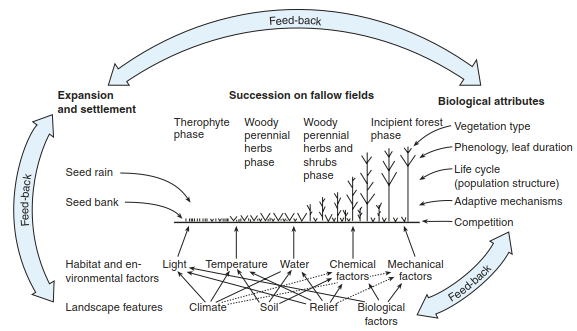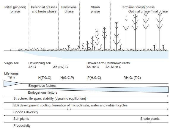 Common dynamic trends, despite the apparent individuality of responses, are summarised in Fig. 17.32. At the beginning of primary succession, chaotic interactions dominate, which cannot be predicted, because input and the establishment of propagules are, to a high degree, stochastic; widely distributed annuals dominate. Between the development of vegetation and changes in the site, feedback mechanisms trigger (Table 17.5). This means that plants themselves contribute, to a considerable degree, to creating environmental conditions that favour conspecific species. The dominance of exogenous factors is only slowly substituted by endogenous factors and is accompanied by a change in species and life forms. In the labile pioneer stages, intra- and interspecific competition is not very important, but in the later stages competition plays a decisive role in the development of communities that become increasingly resistant to external disturbances.
