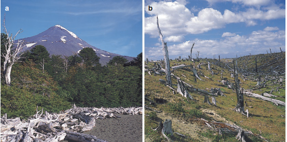 Fig. 17.33. Secondary successions develop after disturbances, which may be natural, for example, a when dead wood accumulates after volcanic activity and subsequent fire in a forest community on the Lanin Volcano in southern Chile. However, b the disturbances can also be human-made, for example, forests cleared by fire for range lands, not for timber, in southern Chile near Aisen. (Photos: K. Müller-Hohenstein)
