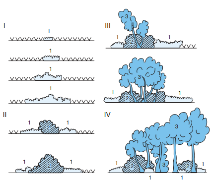 A special case of secondary succession is polycormophyte succession. Vegetative lateral shoots of plants form colonies that are able to expand in closely covered herbaceous plant communities even faster than via seeds. This type of succession usually starts with a pioneer woody species possessing a superior defence against herbivores, for example, Prunus spinosa. Such plants are able to expand over large areas for decades. Finally, taller, unprotected shrubs and trees become established in centres of such areas, so that forest islands and, ultimately, closed forest areas may result. This development can be interpreted as an autogenous succession, regulated by the vegetation itself. The study of this form of succession allows strategies of competition in woody species to be recognised (Fig. 17.36).