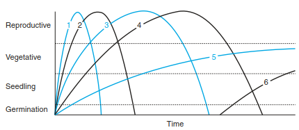 Initial FloristicComposition.The model of initial floristic composition (IFC), based on Egler (1954), is still used to describe the sequence of successions because it represents sequences that are physiognomically recognisable. According to this model, the complete set of species is present from the beginning, and a sequence of starts results in only a few of these species becoming dominant. Figure 17.42 shows the course of growth for six species from germination via establishment of seedlings, through to the vegetative stage, and finally to the reproductive growth phase. Species 1-4 are relatively short-lived therophytes to short-lived woody species, and species 5 and 6 are long-lived, shade- tolerant species. When the latter species are fully developed, the short-lived ones are no longer able to persist. IFC is still accepted as a descriptive model of primary as well as of secondary successions. There are no generally valid succession sequences because of external disturbances and stress situations caused by them. Egler introduced this concept of gradual change as the centre point and prefers the term “development of vegetation” to that of succession. The limitation of such a model is the exclusion of the propagule influx.