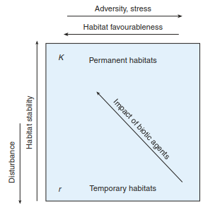 Fig. 17.43. Model of K- and r-selection considering effects of stress. (after Brown 1985 and Brown and Southwood 1987)
