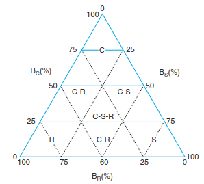 Fig. 17.44. C-S-R diagram of different types of strategy according to Grime. C competitor species; S stress-tolerant species; R ruderal and intermediate types with relative importance of competition (BC), stress (BS) and disturbance (BR). (after Grime et al. 1988)