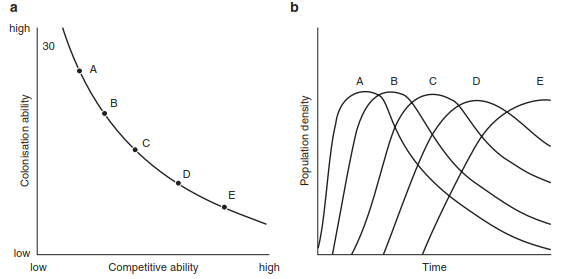 The aforementioned characteristics are accepted as important trade-offs, but a continuum is seen between the extreme positions of r- and K-strategists. This continuum also indicates not only that disturbed habitats are colonised by r- strategists in the short-term (Fig. 17.43) but also that those habitats permanently dominated by K- strategists do not necessarily allow stress-free growth. With the requirement for stress tolerance, a further strategy type is indicated.