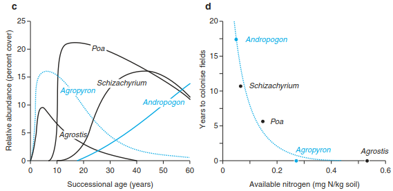 d Observed interdependence of competitive ability and colonisation rates for five dominant grasses of Cedar Creek Natural History Area. R* for nitrogen is the observed level to which monocultures of each species reduced the concentration of dissolved ammonium and nitrate on fertile, low-nitrogen soils (Tilman and Wedin 1991a). Lower R* values correspond to a greater competitive ability (Tilman and Wedin 1991b). The colonisation rate is inversely related to the years each species required to colonise newly abandoned fields at Cedar Creek Natural History Area. (after Tilman 1994)