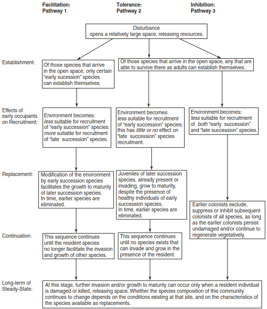 Facilitation-Tolerance-Inhibition Models of Connell and Slatyer. Competition for resources may change by type and amount over time, especially when disturbance regimes are considered. Connell and Slatyer (1977) pointed out that the driving force behind vegetation dynamics and stress is the issue of scale, where certain dynamics only occur at certain scales. As such, three models, or succession pathways, are considered (Box 17.5):