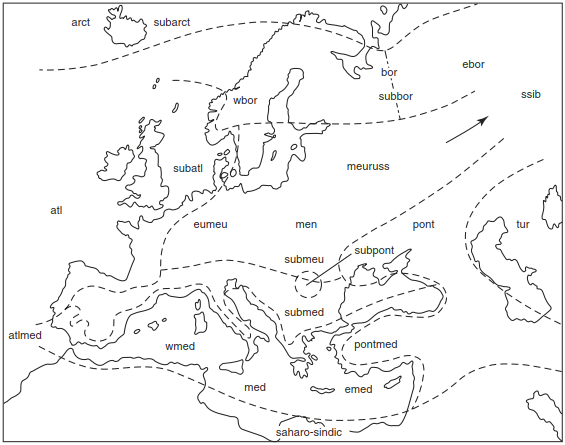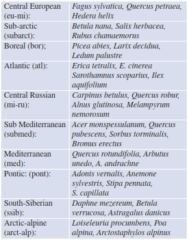 The spatial distribution of area types is linked to climatic characteristics: (1) zonal temperature dependence with latitude, (2) dependence on the duration of the growing season with altitude above sea level, (3) dependence on the influence of oceanic or continental climates that affect temperature ranges. Groups of geo-elements for Europe are shown on the map in Fig. 18.7. The following abbreviations are generally used for the zonal sequence from north to south, which can be further subdivided based on clearly defined floristic contrasts between the observed areas (e.g. sub-Mediterranean).