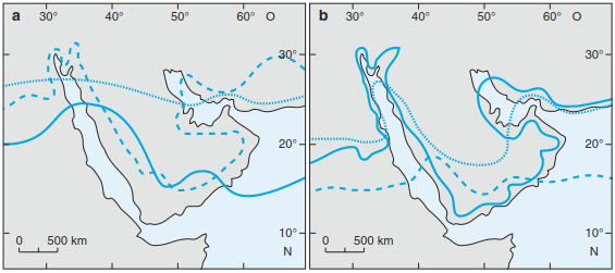 Vegetation may thus be regarded as the combination of species of a certain area or geoelement. The causes of boundaries between areas and types remain poorly understood; however, their evaluation and interpretation can be based on ecological characteristics of the species. For example, Muller-Hohenstein (1988) characterised vegetation units on the Arabian peninsula using an area typological approach (Fig. 18.8). The figures show the different interpretations of the boundaries, which could then be used by climatologists and plant geographers. It is easy to see from this figure that there is a lot of variability between boundaries, suggesting that the north-eastern Arabian coastal regions should not be classified as tropical, according to neither the climate nor the vegetation.