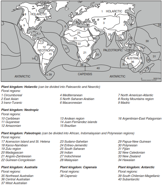 Area types and the corresponding geoelements are the basis of a hierarchical division of the Earth according to floral relationships. At the highest level of this hierarchy are the six plant kingdoms. This division is made on the best possible homogeneity within and the greatest contrast between neighbouring units. The differentiation is mainly based on the geographical positions in which these species have developed for different periods in isolation. To define the plant kingdoms, mainly higher taxonomic units (families) are used, which are based on not only their exclusive distribution but also the spatial centres of their distributions. Plant kingdoms can be further subdivided into floral regions and floral provinces (Fig. 18.9). The early separation of the southern continents with the corresponding formation of three plant kingdoms, Antarctic, Capensis and Australis, is particularly important. The sole plant kingdom in the northern hemisphere, which covers the middle and higher latitudes, is the Holarctic. In the lower latitudes of the tropics, the Palaeotropics and Neotropics are differentiated.