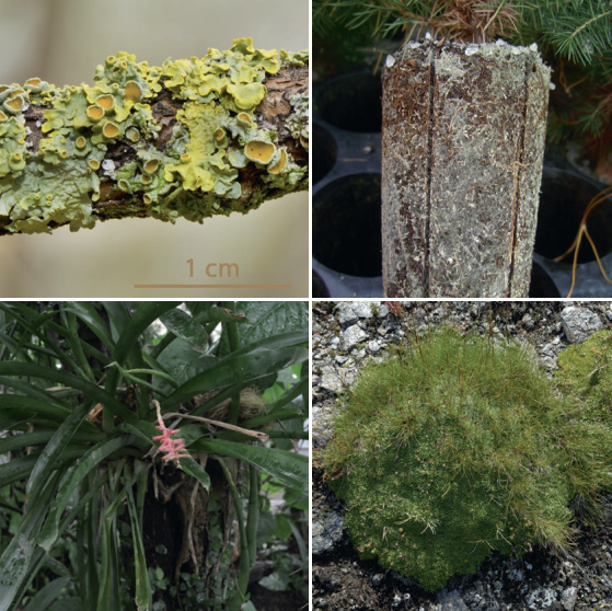 Fig. 19.6. Examples of plant–plant and plant–fungi interactions. Close symbiosis (lichens: top left), mycorrhization of Picea glauca roots (top right), bromeliad epiphyte on tree (bottom left) and facilitation of Poa alpina by alpine cushion plant Silene acaulis (bottom right). (Photos: top left: N. Nagel, top right: Silk666, bottom left: M. Scherer-Lorenzen, bottom right: C.F. Dormann)