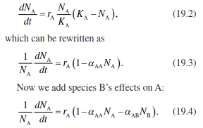 The key idea in competition models is to express the competitive effects of species A on B in multiples of the effect of A on A, that is, the balance of inter- versus intraspecific competition. All else being equal, if B is twice the biomass of A, each individual of B should have twice as much effect on A as an individual of A. To be able to put this into a simple formula, we first recall that the density-dependent growth of a population of species A can be represented by a logistic equation: