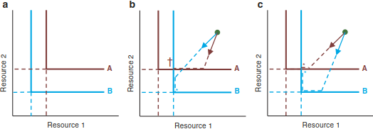 Figure 19.11 illustrates competition between species A (red) and B (blue) for resources 1 and 2. The lines (“zero-growth isoclines”) indicate the minimum requirements for the two resources. In Fig. 19.11a, species B has lower resource requirements than A for both resources (indicated by the dashed lines). In this situation, B will always deplete resources to a value below A’s requirements, so A will go extinct.