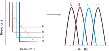 As the ratio of resources changes (Fig. 19.12 right: R1:R2), different pairs of species coexist at different positions of the resource-ratio gradient. In systems with spatially variable resource ratios, the coexistence of several species becomes possible.