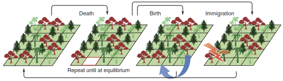 Fig. 19.13. Neutral community dynamics. All species are assumed to be equivalent to each other; death, birth and immigration processes are purely stochastic. Such neutral dynamics lack stabilising processes and hence do not lead to coexistence. Thus, any given local community will display species turnover (“ecological drift”), with amount and distance of dispersal and the size of the entire community determining local species richness (Rosindell et al. 2011). Reproduced with permission from Elsevier