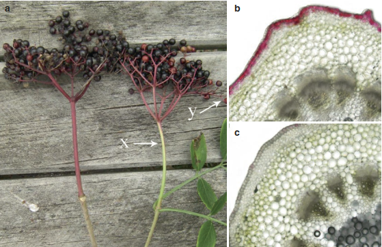 Fig. 19.30. Phenotypic plasticity influencing seed dispersal. The red peduncles of black elder (Sambucus nigra) are a stress response that may also be related to senescence, and they attract seed dispersers to the infructescence. The peduncles (X) vary predictably in their colour from red to green a according to the intensity of ambient light. Pedicles (Y) are mostly red. Anthocyanin pigmentation in the peduncle is restricted to the outermost layers of hypodermal collenchyma b and absent in green peduncles c. (Cooney et al. 2015)