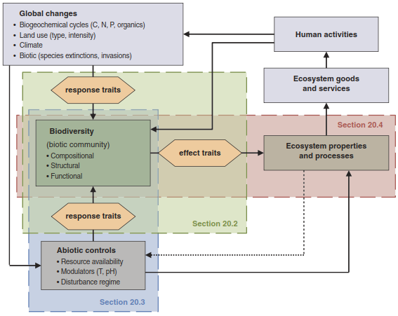 This chapter presents the various facets and definitions of biodiversity, focusing on compositional, structural and functional aspects, where feedbacks between ecosystem services, human activities, global changes and ecosystems are dealt with in Chap. 23. Solid lines represent direct influences and the dotted line shows a feedback loop. Modified from Hooper et al. (2005), reproduced with permission from John Wiley & Sons also the concept of plant traits will be introduced (Sect. 20.2). In a subsequent part, observed patterns of biodiversity in response to environmental factors will be presented (Sect. 20.3). Finally, Sect. 20.4 discusses the effects that biodiversity changes have on the properties and functions of ecosystems. The effects of management and human activities are dealt with in Chaps. 17 and 23.