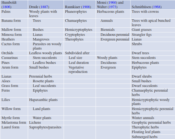 Important structural characteristics of a plant include architectural traits, for example, height and branching patterns, leaf form and root stratification. Several attempts were made by plant geographers, as well as by ecologically orientated botanists, to differentiate between life forms based predominantly on structural features. Even the Greek philosopher Theophrastus (ca. 371— 287 BC) already thought about criteria by which to categorise plants according to their physiognomy, that is, the outer appearance of living things. He came up with a tree, shrub, perennial herb and “useful” plant categorisation. These attempts show that it is very difficult to cope with the great diversity of structural features in the plant kingdom (Table 20.3).