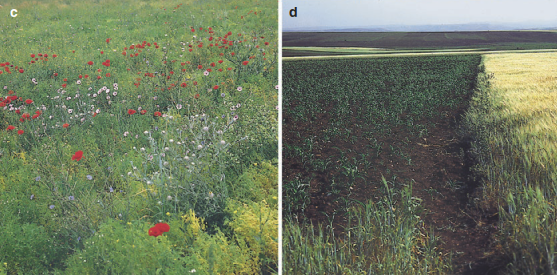 Fig. 20.5. Structural diversity and species richness. A tropical rain forest in Indonesia a, rich in species and in structures, has a structural diversity that is similar to that of an extra-tropical rain forest b, poor in species but rich in structure. However, the number of higher plant species differs ten-fold between both forest types. Cultivated cereal fields are single layered and as such poorer in structure than forests. Nevertheless, there are large differences in species richness among differently cultivated fields: a species-rich but structure-poor fallow c and a species- and structurepoor cereal field d, both located in Mediterranean areas of Morocco
