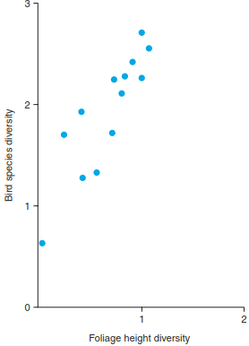 Fig. 20.6. Structural diversity in plant communities often begets biodiversity of other organisms. Bird diversity in temperate, deciduous forests of north-eastern North America is positively correlated with the structural diversity of the tree canopy. Foliage height diversity is a measure of habitat structural complexity and has been calculated as Shannon’s diversity index with the proportion of the total foliage in several horizontal layers. Bird species diversity is Shannon’s diversity index of breeding bird species territories recorded per 5 acres (approx. 2 ha). Two data points from a tropical savanna and from a pure spruce forest are also included