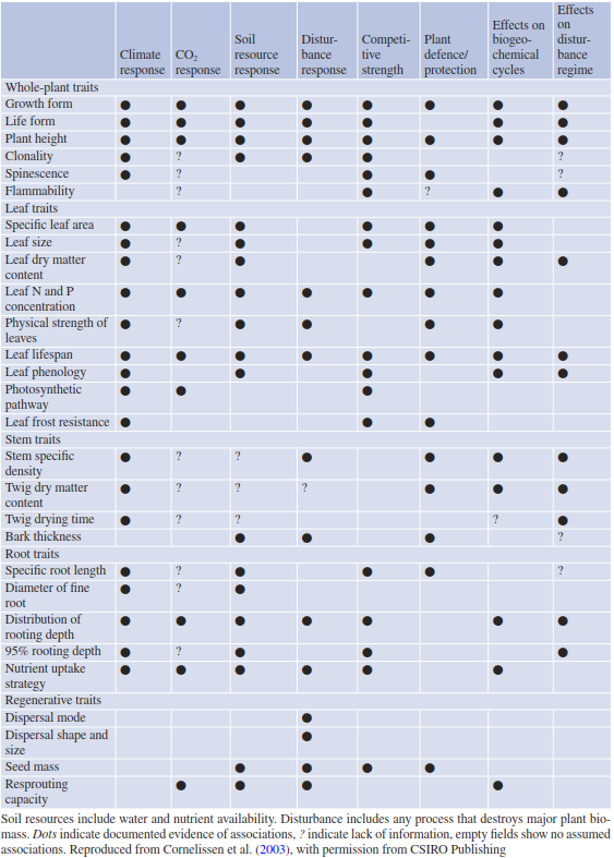 Table 20.4. Association of selected traits with plant responses to environmental changes, plant competitive strength and protection against herbivores and pathogens, and effects on biogeochemical cycles and disturbance regimes