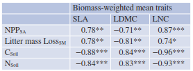 Table 20.5. Predicting ecosystem properties by plant traits. Pearson correlation coefficients between SLA, that is, the ratio of water-saturated leaf area to leaf dry mass (m2 kg−1), leaf dry matter content (LDMC), that is, the ratio of leaf dry mass to water-saturated fresh mass (mg g−1), or leaf nitrogen concentration (LNC) (mg g−1), with specific above-ground net primary productivity (NPPSA), that is, net primary production expressed on a per gram green biomass basis (g kg−1 day−1), specific rate of litter mass loss (Litter Mass LossSM, that is, decomposition rate expressed per unit biomass (g kg−1 day−1), total soil organic carbon concentration (CSoil) (g kg−1) and total soil nitrogen concentration (NSoil) (g kg−1). Biomass-weighted mean traits were calculated as aggregated on a community level. *p < 0.05; **p < 0.01; ***p < 0.001 (Garnier et al. 2004)