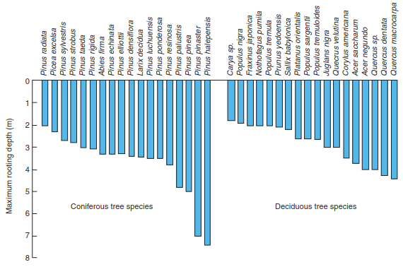 Fig. 20.7. Maximum rooting depth of temperate coniferous and deciduous tree species. Species within functional groups largely vary in trait expression, resulting in substantial overlap between both groups.