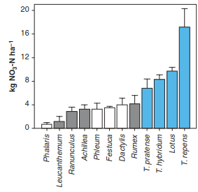 Fig. 20.8. Effects of different species on soil nitrate availability. Species were grown in monocultures under identical environmental conditions, so that differences in soil nitrate availability are only due to ecological differences among species. Legumes (blue) fix nitrogen, but to varying degrees, resulting in higher nitrate values than under forbs (grey) and grasses (white). Phalaris: P. arundinacea, Leucanthemum: L. vulgare, Ranunculus: R. acris, Achillea: A. millefolium, Phleum: P. pratense, Festuca: F. ovina, Dactylis: D. glomerata, Rumex: R. acetosa, Lotus: L. corniculatus, T.: Trifolium