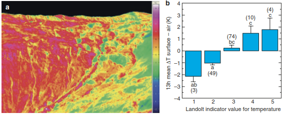 Fig. 20.13. Small-scale temperature heterogeneity in alpine grasslands. a False colour image based on infrared thermography of surface temperatures on a NNW exposed slope at the Furka Pass in the Swiss Alps under full direct solar radiation (12–18 h, August). Dark blue represents cold (2 °C) and magenta hot (24 °C) surface temperature (Scherrer and Körner 2010). Reproduced with permission from John Wiley & Sons. b Seasonal temperature differences between surface and air temperature during daytime hours per group of temperature indicator values. The numbers in brackets indicate the number of plant species within the different indicator groups; significant differences are denoted by different letters
