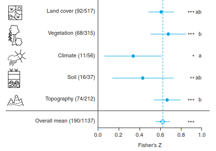 Fig. 20.14. Positive relationship between environmental heterogeneity and species richness. Effects of environmental heterogeneity were analysed separately for different categories (land cover, vegetation, climate, soil, topography). Mean effect sizes (Fisher’s z) that are significantly larger than zero indicate positive relationships; lines show 95% confidence intervals. Different letters indicate significant differences among categories. Diamond and dashed lines represent the overall weighted mean effect. Numbers in parentheses give the respective numbers of studies/data points. All coefficients are different from zero at significance levels: ***p < 0.001, **p < 0.01, *p < 0.05. Modified from Stein et al. (2014)