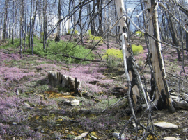 Fig. 20.15. Disturbances create “windows of opportunities” for species establishment. Species previously absent from a plant community are able to colonise a site after disturbances, such as fire. Saponaria ocymoides (pink flowers) and Isatis tinctoria (yellow) 4 years after a stand-replacing fire in the Swiss Alps (Leuk)