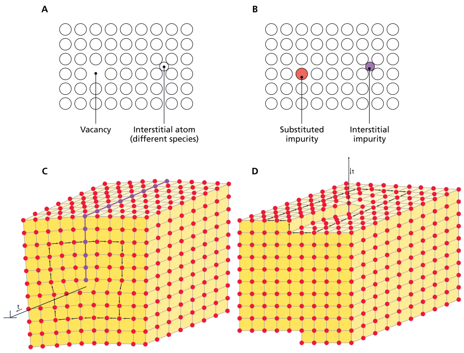 Despite appearing nearly perfect to the naked eye, crystals invariably contain millions of atomic-scale defects. These imperfections include vacancies within the crystal lattice, various types of atomic arrangement irregularities, and substitutional defects where one atom or ion replaces another of similar charge and size.