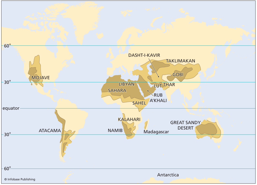 World map showing location of deserts: Note how most deserts are concentrated between 15° and 30° latitude