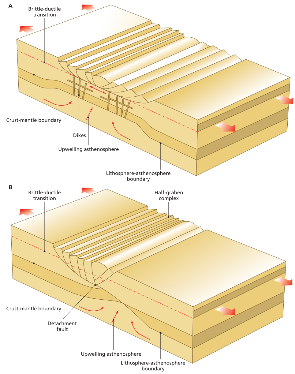 Modes of extension in rifts. (A) Shows pure shear model, in which the lithosphere extends symmetrically and asthenosphere rises to fill the space vacated by the extending lithosphere. (B) Shows simple shear or asymmetric rifting, where a shallow-dipping detachment fault penetrates the thickness of the lithosphere, and asthenosphere rises asymmetrically on the side of the rift where the fault enters the asthenosphere. Faulting patterns are also asymmetric, with different styles on either side of the rift.