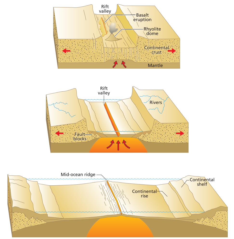 Figure showing simplified three-stage evolution of divergent margins. The young rift valley stage like that in the East African rift system has steep rift shoulders and basaltic and rhyolitic volcanoes. The young ocean stage, similar to the modern Red Sea, has seafloor spreading and steep rift shoulders. Mature ocean stage is like the modern Atlantic Ocean, with thick passive margin sequences developed on continental edges around a wide ocean basin.