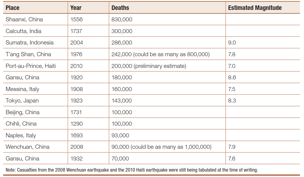 Intraplate Earthquakes and Historical Devastation. Certain regions distant from active plate boundaries remain susceptible to infrequent yet highly destructive earthquakes, demonstrating that seismic hazards extend beyond tectonic margins. Cities including Boston (Massachusetts), Charleston (South Carolina), and New Madrid (Missouri) have experienced historically significant intraplate earthquakes with widespread impacts. Between 1811 and 1812, three major earthquakes measuring magnitudes 7.3, 7.5, and 7.8 struck the New Madrid region, shaking nearly the entire United States and causing destruction reported as far away as Boston and Canada, where chimneys collapsed, plaster cracked, and church bells rang from ground motion. Historical earthquakes have produced catastrophic human tolls, including the 1556 Shaanxi earthquake in China, which killed between 800,000 and 900,000 people; the 1976 Tangshan earthquake, with estimated fatalities ranging from 242,000 to 800,000; and the 2004 Indian Ocean tsunami, which claimed approximately 286,000 lives. The 2008 magnitude 8.0 Wenchuan earthquake in China recorded an official death toll of approximately 90,000, though unofficial estimates suggest up to one million fatalities.