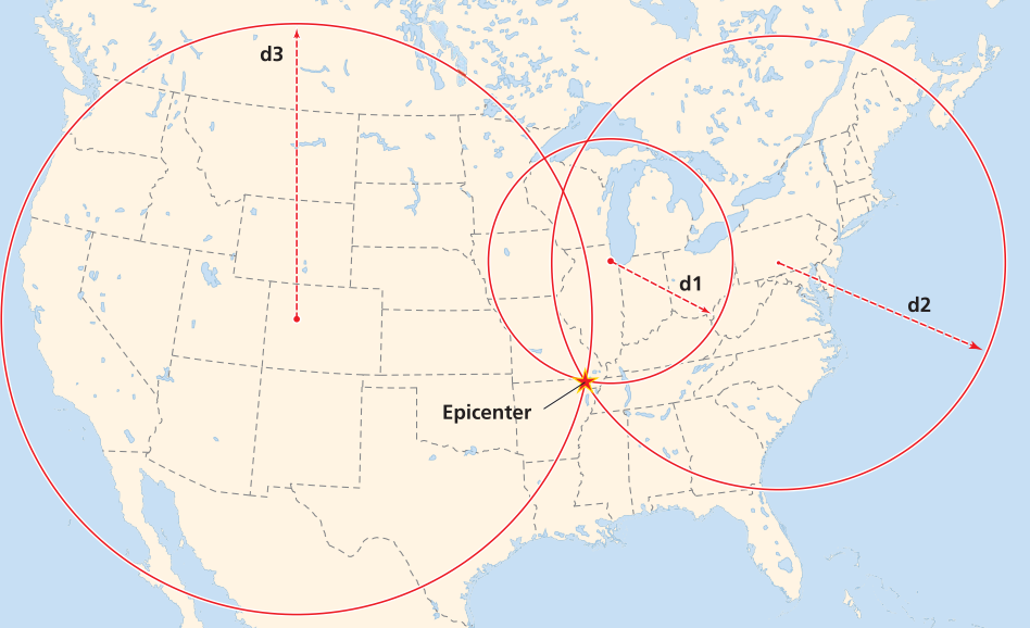 Method of locating epicenters by calculating the distance to the source from three different seismic stations. The distance to the epicenter is calculated using the time difference between the first arrivals of P- and S-waves. The unique place that the three distance circles intersect is the location of the epicenter