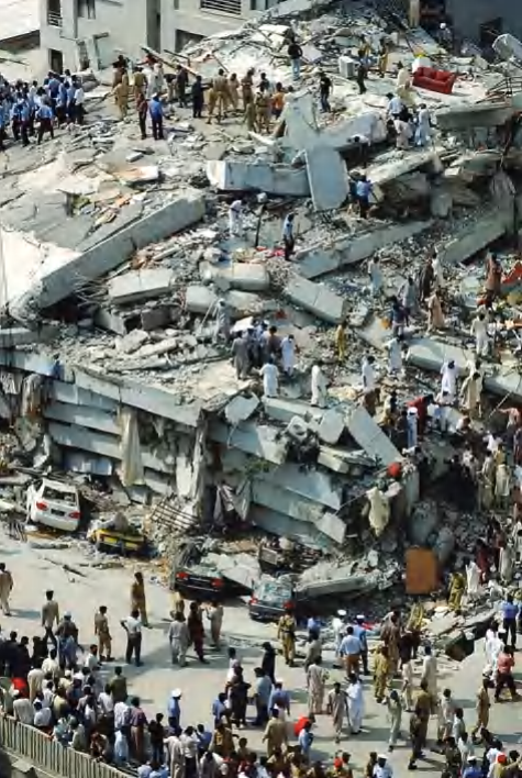 Collapsed 10-story apartment building in Islamabad, Pakistan, after earthquake October 8, 2005: The building pancaked as one floor fell, thereby causing each lower floor to collapse. (AP images)
