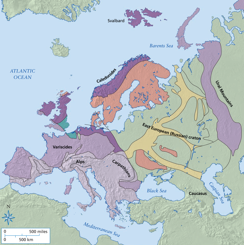 Simplified geological map of Europe showing the location of the Alps, Caledonides, East European (Russian) craton, Urals, Svalbard, and Caspian Sea
