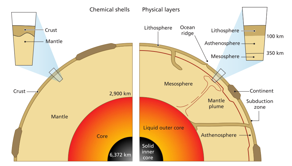 Cross sections of the Earth showing chemical shells (crust, mantle, and core) and physical layers (lithosphere, asthenosphere, mesosphere, outer core, and inner core)