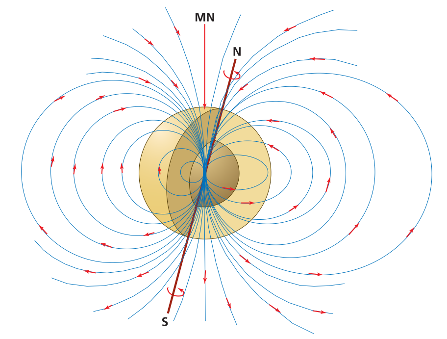 Magnetic field lines of Earth approximate the shape of the field produced by a bar magnet. Magnetic field lines point upward out of the south magnetic pole and form imaginary elliptical belts of equal intensity around Earth and plunge back into Earth at the magnetic north pole. Note how the magnetic poles are not coincident with the rotational poles. The orientation of the magnetic field at any point on Earth can be expressed as an inclination (plunge into Earth) and a declination (angular distance between the magnetic and rotational north poles)