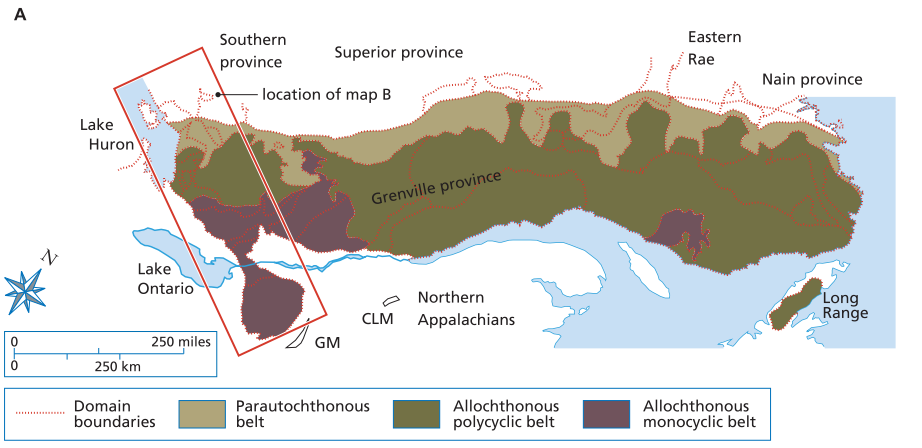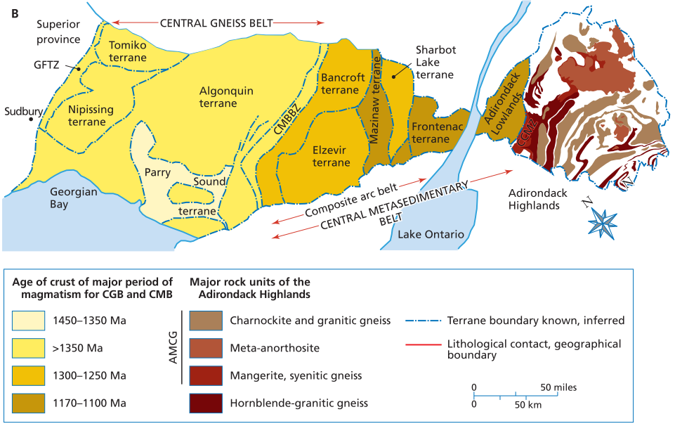 The Central Gneiss Belt (CGB) , located in the western portion of the Grenville Province, contains some of the region’s oldest rocks, predominantly 1.8–1.6 Ga gneisses intruded by 1.5–1.4 Ga granitic and monzonitic plutons. Both metasedimentary and igneous rocks within the CGB are metamorphosed to upper amphibolite and locally granulite facies, with a dominant northeast structural trend that shifts northwest near Georgian Bay. The CGB is bounded by the Grenville Front to the northwest and lies in tectonic contact with the Central Metasedimentary Belt to the southeast, subdivided into smaller terranes—Nipissing, Algonquin, Tomiko, and Parry Sound—based on lithology, metamorphic grade, and bounding shear zones. These terranes are predominantly parautochthonous (having experienced limited transport), with shear zones separating them exhibiting kinematic indicators consistent with northwest-directed tectonic transport between 1.18 and 1.03 Ga.