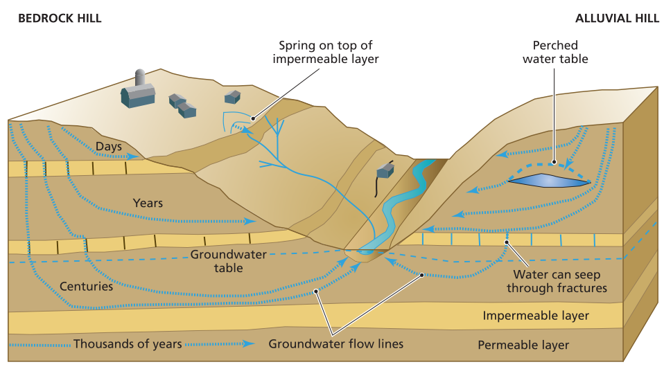 Schematic diagram of the groundwater system. Water enters the system on hillslopes and emanates lower on hills as springs and in effluent streams